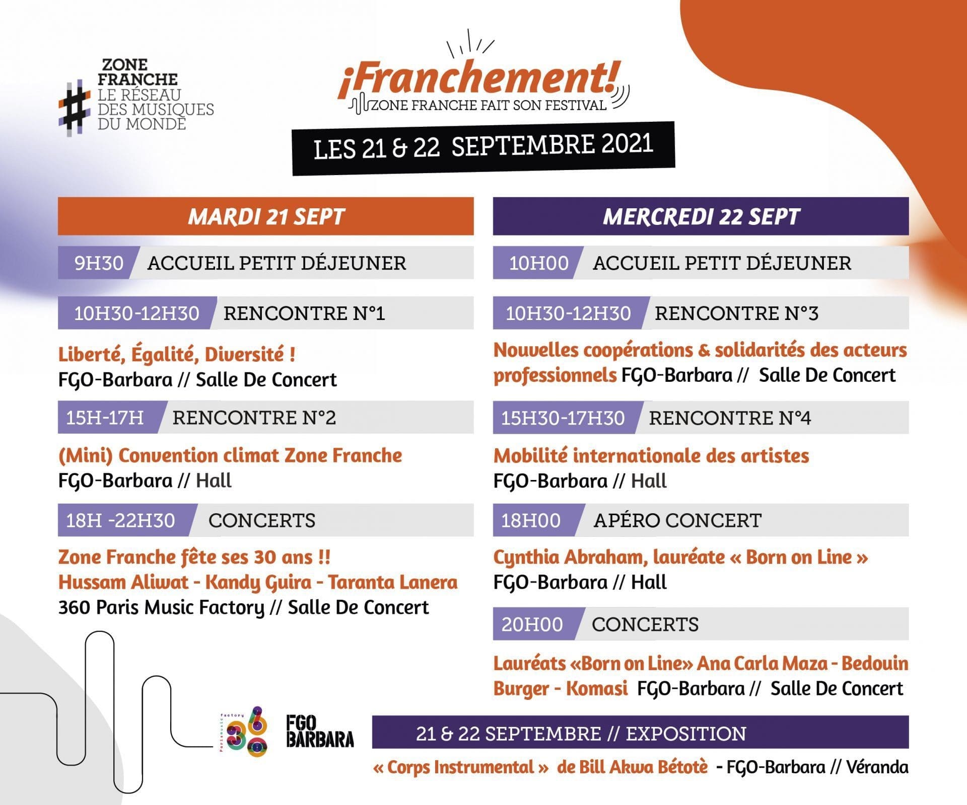 Pour l’occasion, Zone Franche organise ¡ FRANCHEMENT !, les 21 et 22 septembre 2021 à Paris. Deux jours de concerts et de rencontres professionnelles organisés au 360 Paris Music Factory et à FGO Barbara avec l’ambition d’encourager la reprise du secteur aujourd’hui sinistré, de fédérer et de soutenir ses professionnels et de partager avec le public les émotions des musiques de la diversité !