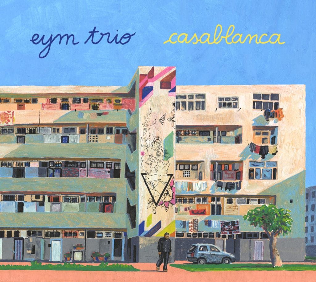 Le cinquième album du trio EYM, Casablanca reflète l’état d’esprit nomade du trio et nous embarque dans un jazz qui se joue des frontières. L’album Casablanca a pris son envol à la faveur d’une rencontre importante pour le trio qui est la rencontre avec le dessinateur Simon Lamouret, auteur de la pochette, et d’un superbe clip sur Youtube.