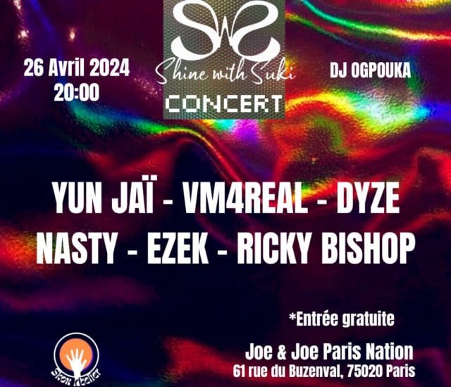 Notre association s’engage à rendre l’art accessible à tous, en brisant les barrières financières qui limitent souvent l’accès à différentes formes d’expression artistique telles que la peinture, la couture ou la création musicale. En plus de notre passion pour la musique, nous célébrons la diversité des talents émergents dans ces domaines. C’est pourquoi nous offrons des entrées gratuites à cet événement, permettant à chacun de découvrir et d’apprécier la diversité musicale de talents émergents tels que Yun Jaï, Vm4real, Dyze, Ezek, Nasty et Ricky Bishop. Rejoignez-nous pour une nuit de découverte et de partage, où l’expression artistique est au cœur de tout ce que nous faisons. Obtenez vos billets gratuits dès maintenant sur le lien : https://my.weezevent.com/shine-with-suki-concert
